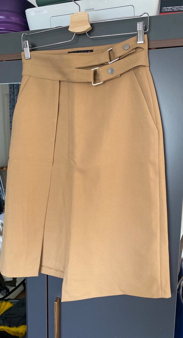 Bej renkli, kemerli ve midi uzunlukta olan bu eteği, parlak görünümlü sentetik kumaştan üretilmiştir. Düz deseni ve rahat kesimiyle ofis ve sokak stiline uygundur. ✨