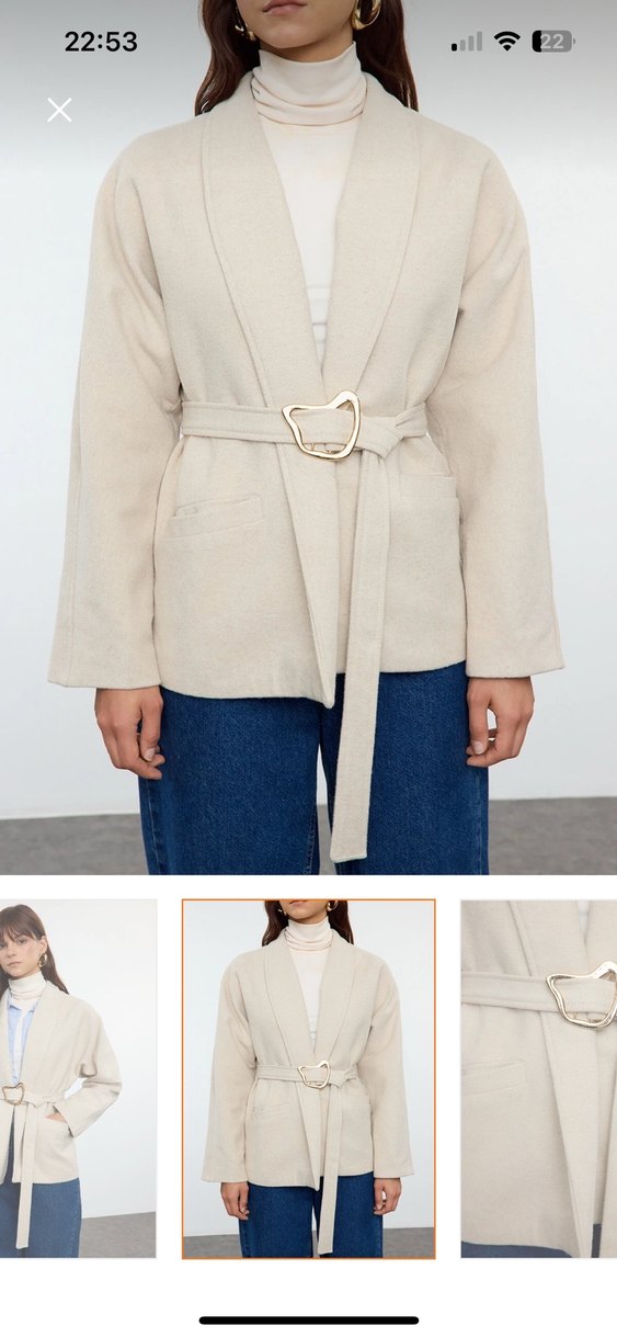 Bej renkli kaşe, kemerli ve yakalı midi uzunlukta kadın kaban. Uzun kollu, rahat kesimdir, günlük kullanıma uygundur. Çok az giydim, yeni, dolapta fazlalık olduğu için satılık.