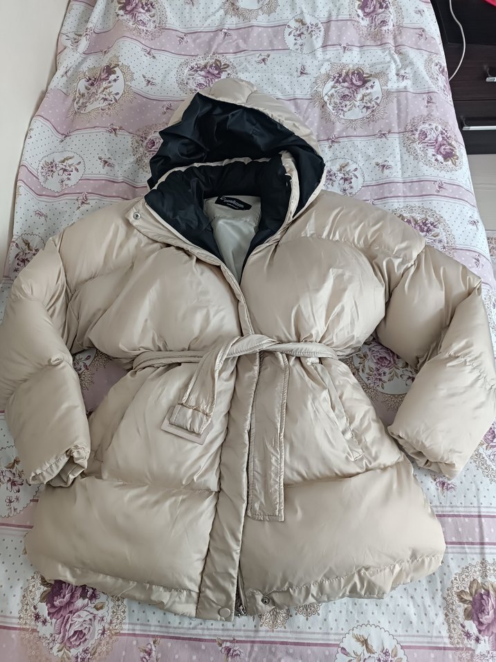 Bir kez dahi giyilmemiştir, Bej renkli, kemerli ve normal boyda, suni kumaştan yapılmış kadın kışlık mont. Notlu yaka ve askılı kolları ile sade ve rahat bir tasarıma sahiptir. ❄️ m/l uyumlu