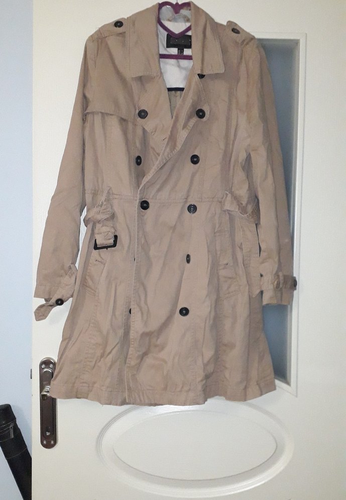 Bej renkli, keten kumaştan, kemerli ve bol kesim midi trençkot. Uzun kollu, Paris tarzı günlük sokak modasına uygun bir model.ürün ütüsüz oldugu için bu şekilde görünuyor lekesi vs yok sadece küçük bir defosu var