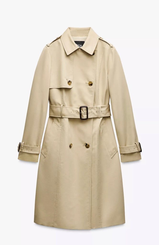Bej renkli, kemerli midi uzunlukta kadın trençkot. Klasik kesim, notched lapel yaka ve askılı kollara sahiptir. ürün sıfır hiç kullanılmadı sadece etiketi mevcut değil yeni sezon zara marka