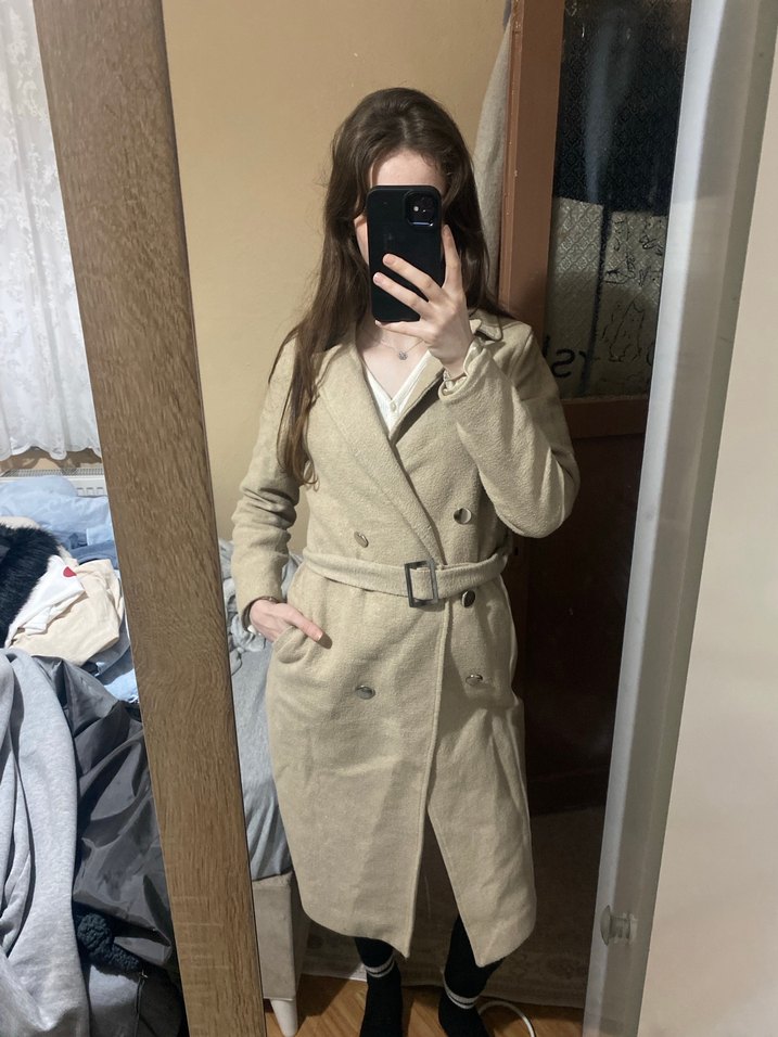 Bej renkli, keten kumaştan yapılmış, kemerli midi trençkot. Notch yaka ve uzun kollu, günlük sokak stili ve iş kombinlerine uygun regular kesim.