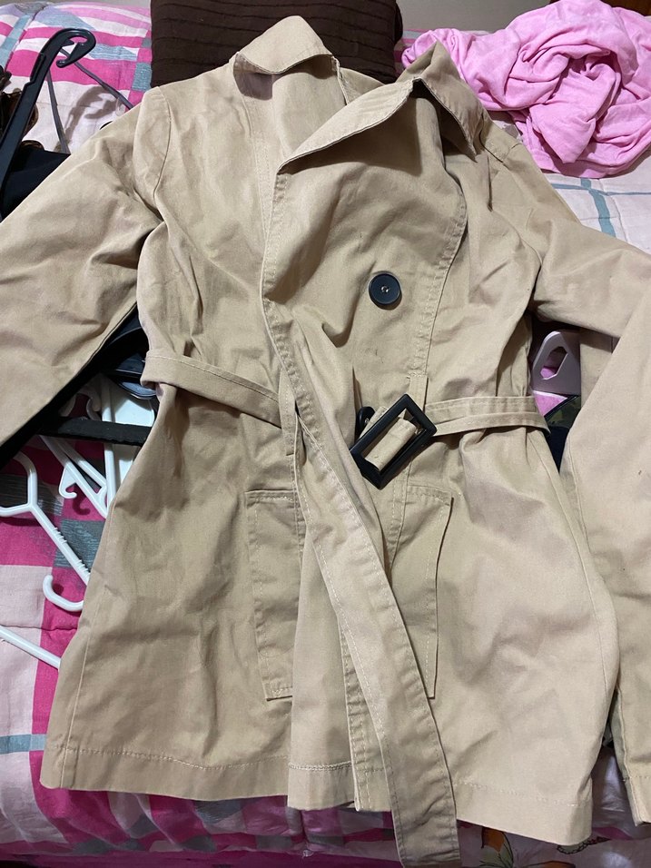 Bej renkli, kemerli ve normal boy midi trençkot. Dar kesim, çentikli yaka ve yumuşak sentetik kumaş kullanılmış. Rahat sokak stili için uygundur.