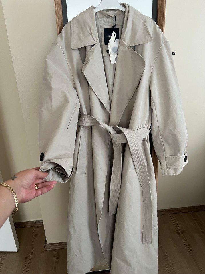 Bej renk, keten kumaştan, kemerli, uzun kollu, notched lapel yakalı, midi boy, bol kesim trench coat.