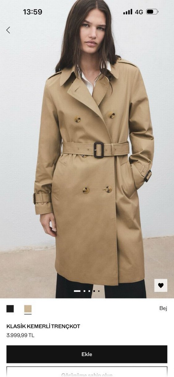 Bej renkli, kemerli, normal boy midi trençkot. Uzun kollu, klasik kesim ve rahat sokak stili sunar.