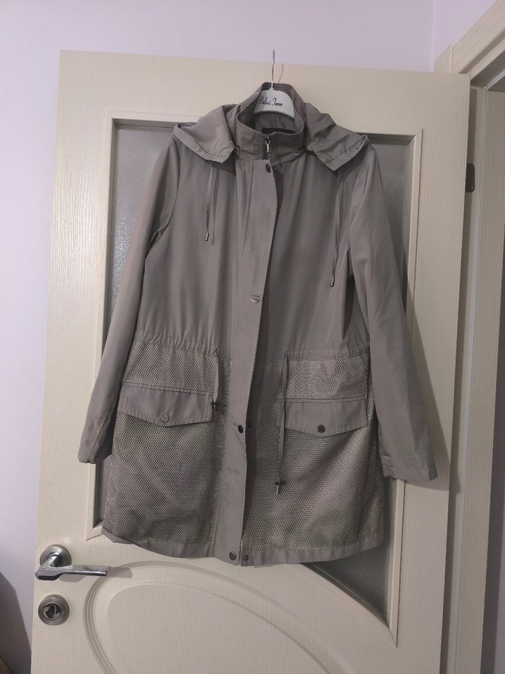 bej renk, kemerli midi yağmurluk. Gevşek kesim, uzun kollu marka temsilidir asıl marka sarar