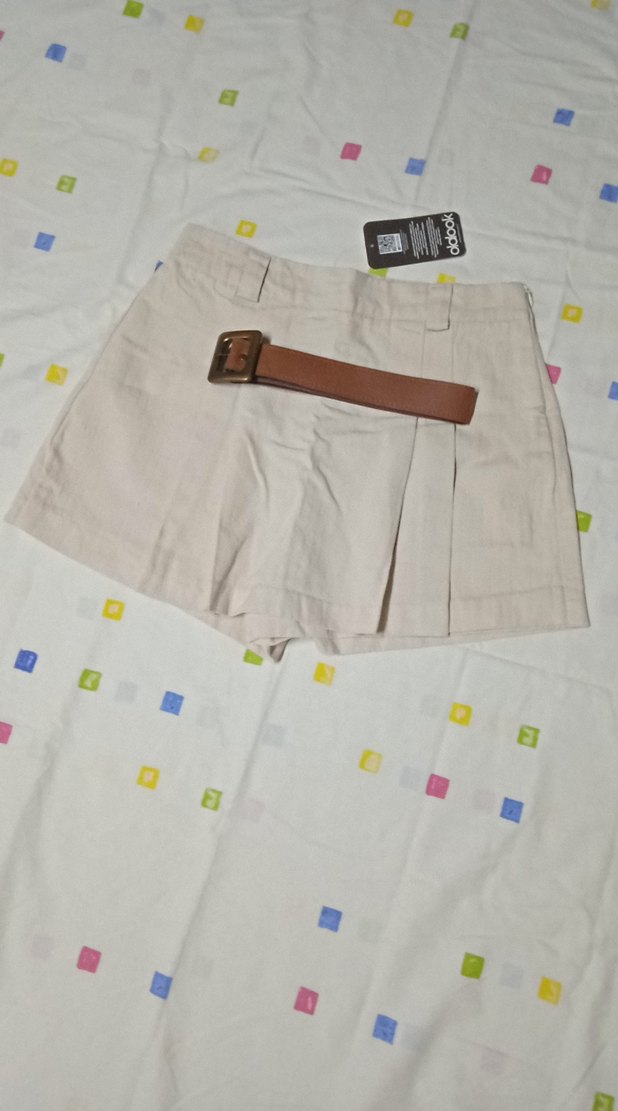 Bej renkte, pamuklu kumaştan bol kesim mini şort, kahverengi kemerle tamamlanmıştır. Günlük rahat sokak stili için uygundur.