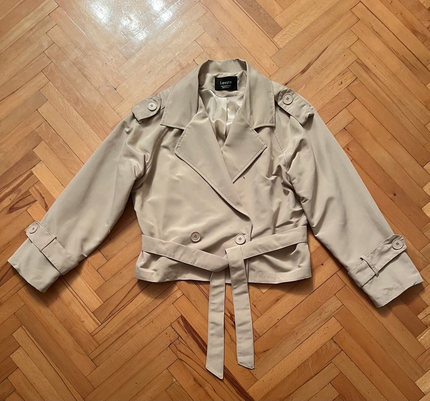 Bej renkli kadın trençkot, kemerli ve kesik yakalıdır. Askılı kollu, normal kesim ve kısa boydadır. Günlük kullanım için uygun, sentetik kumaştan üretilmiştir.