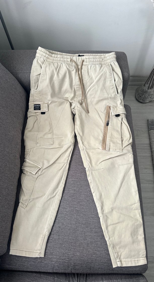 Bej renkli, pamuklu kumaştan, rahat kesime sahip erkek pantolon. Kemerli ve çoklu ceplidir, dış mekan için uygundur. ️