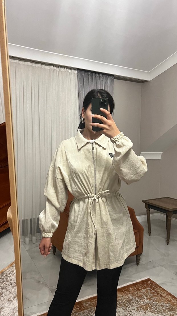 Bej renkli, keten kumaştan, kemerli ve uzun kollu rahat kesim kadın kaban. Günlük kullanıma uygun, salaş ve şık.