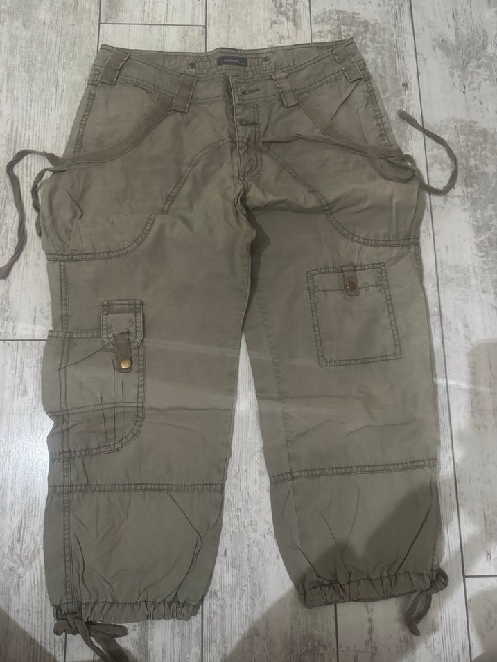 Bej keten pantolon, kemerli ve bol kesimdir. Çoklu cepler ve paçalarında bağcıklı detaylar bulunur. Sokak stili ve dış mekan kullanımı için uygundur.