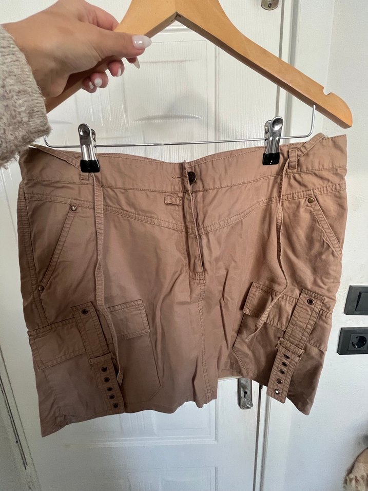 Bej renkli, keten kumaştan, kemerli ve rahat kesim mini etek. Günlük sokak stili ve açık hava etkinlikleri için uygundur.