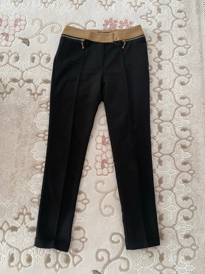 Düzenli kesim, bej kemerli siyah kumaş kadın pantolon. Midi boy, desen içermeyen koyu renkli ve ofis tarzına uygun. Sentetik kumaştan, şık ve rahat.