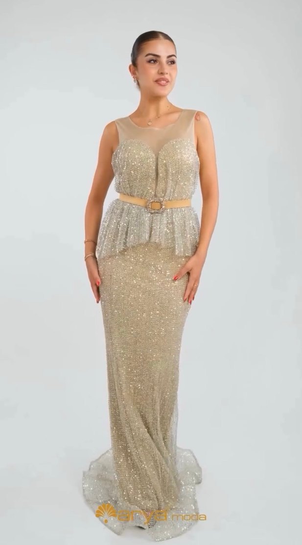 Kemer detaylı, kolsuz bej uzun abiye elbise. Aryamodadan alındı sıfırdır. 40 42 bedene uyumludur