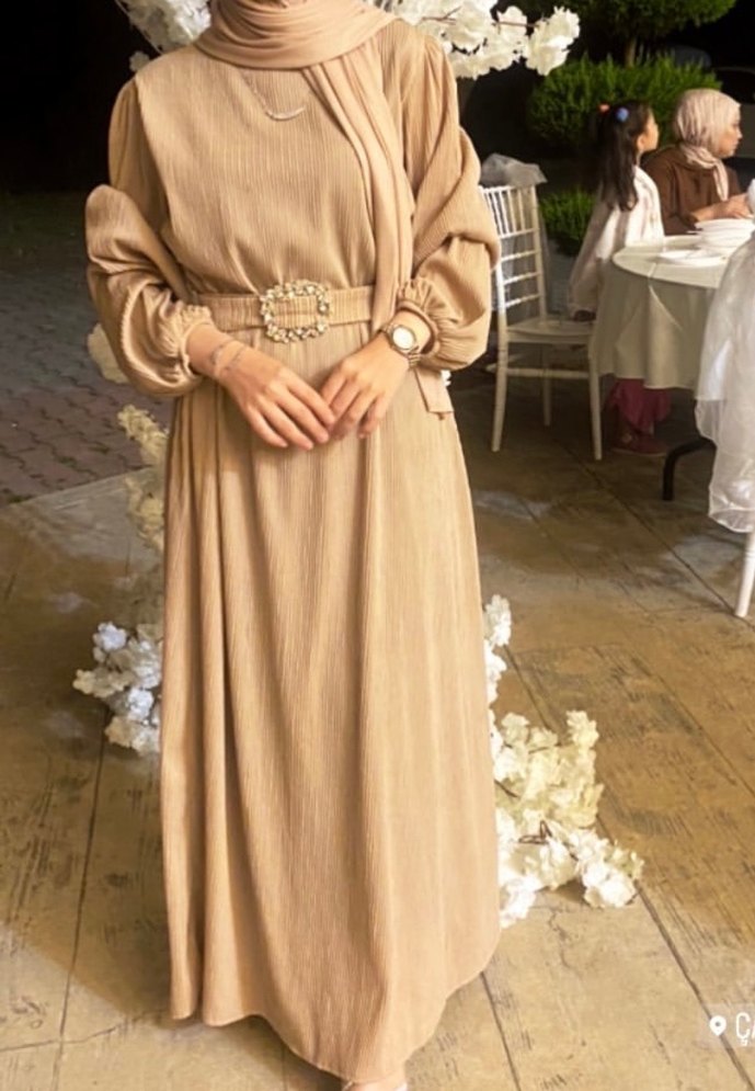 Bej Kemerli Uzun Bohem Elbise
