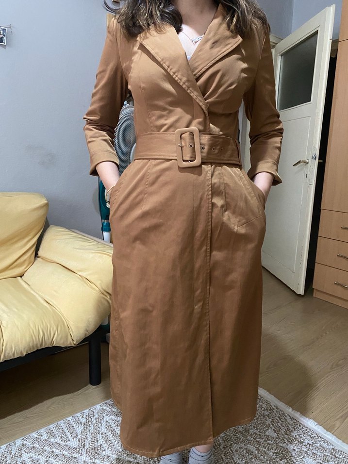 Bej renkli, kemerli ve yakalı uzun elbise . Strappy kollu, regular fit ile günlük şıklık sağlar.