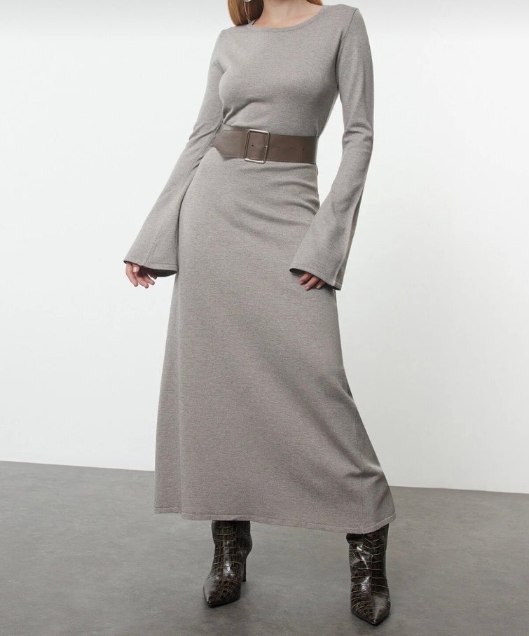 Bej-gri tonlarında, uzun kollu, tek parça, tek renk, yumuşak sentetik kumaştan yapılmış, tekne yaka ve vücuda oturan uzun elbise.