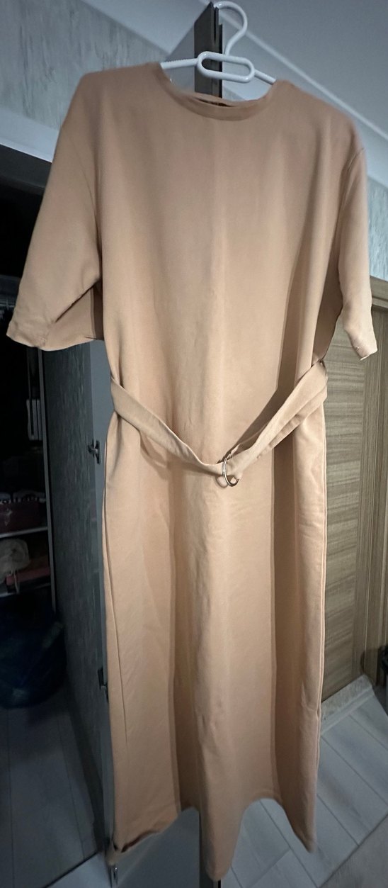 Bej renkte, kemerli, kısa kollu ve yuvarlak yakalı uzun kadın elbisesi. Minimalist ve sokak stiliyle günlük kullanıma uygun.