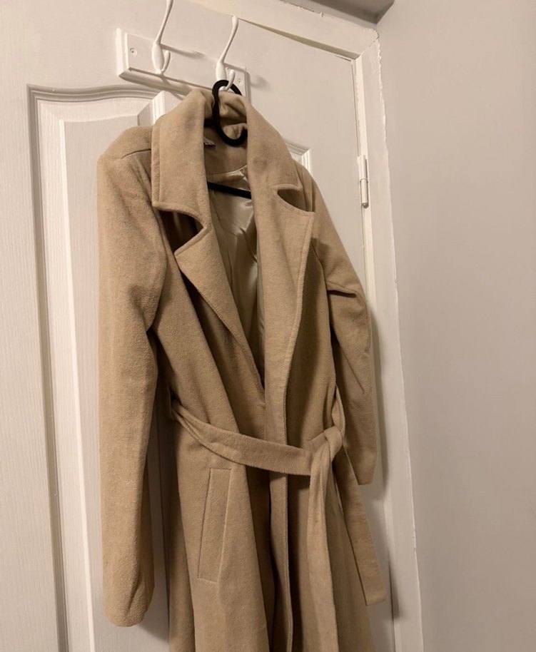 Bej renkli, kemerli ve uzun kesim kadın kabanı, klasik ve minimalist tarz sunar. Keten kumaştan, normal kesim ve askılı kollu, günlük kullanıma uygundur. Hiç giyilmedi marka temsilidir