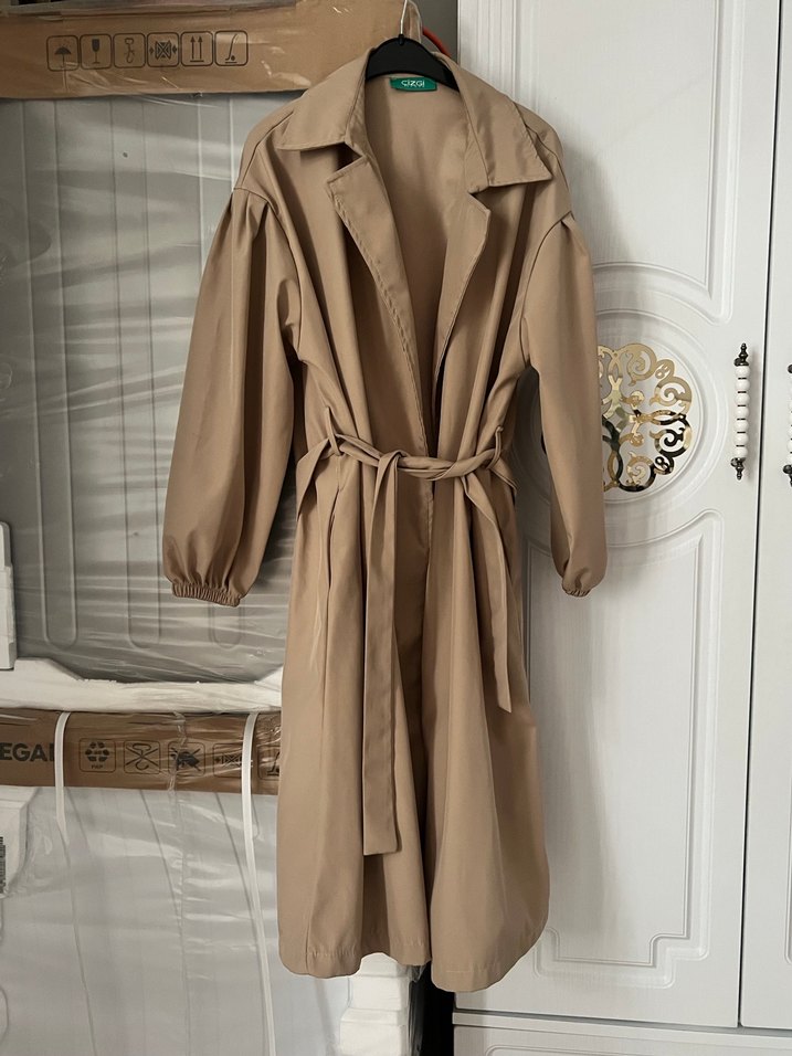 Bej renkli, keten kumaştan yapılmış uzun trençkot. Kemerli, bol kesim ve kol detayları strappy. Yaka tipi notched lapel, desensiz, günlük sokak stili için uygun.