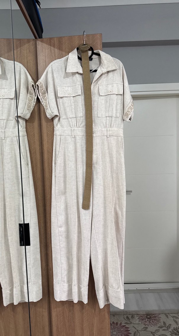 Kadınlar için bej renkli, kemerli ve uzun kesime sahip tulum. Yaka kısmı notched lapel, askılı kolları ve rahat kesimiyle günlük kullanıma uygun.