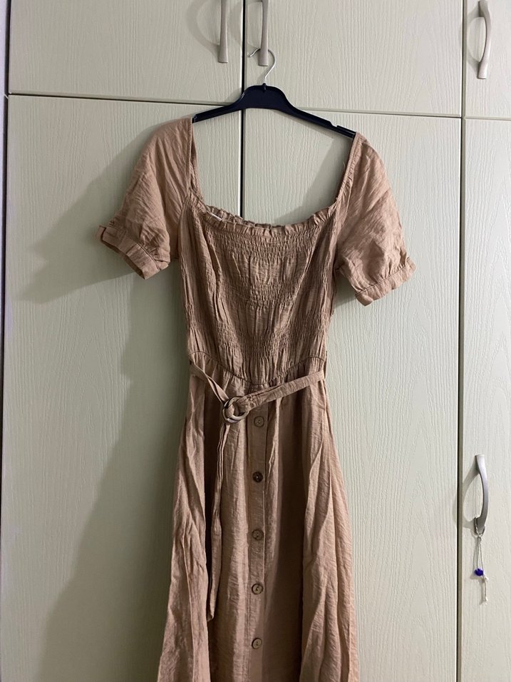 Kemerli bel, bol kesim, kayık yaka ve askılı kollara sahip bej uzun keten elbise, minimalist bohem tarzı için uygundur.