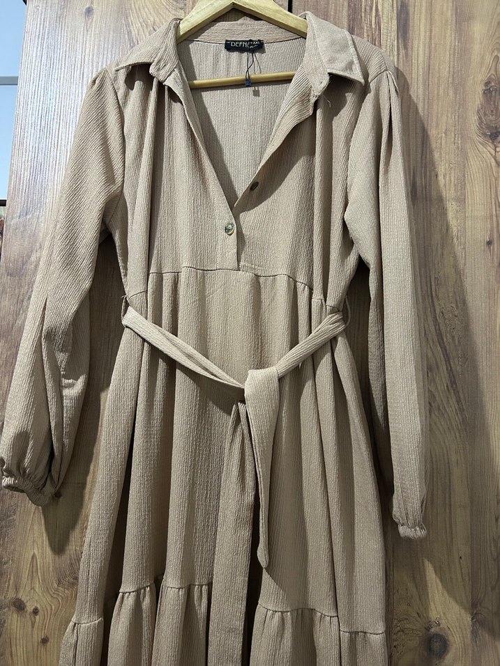 Bej keten kumaştan uzun elbise, yakası kesik ve uzun kolludur. Kemerli bel ile bol kesim sağlar, trend gündelik tarz için uygundur.