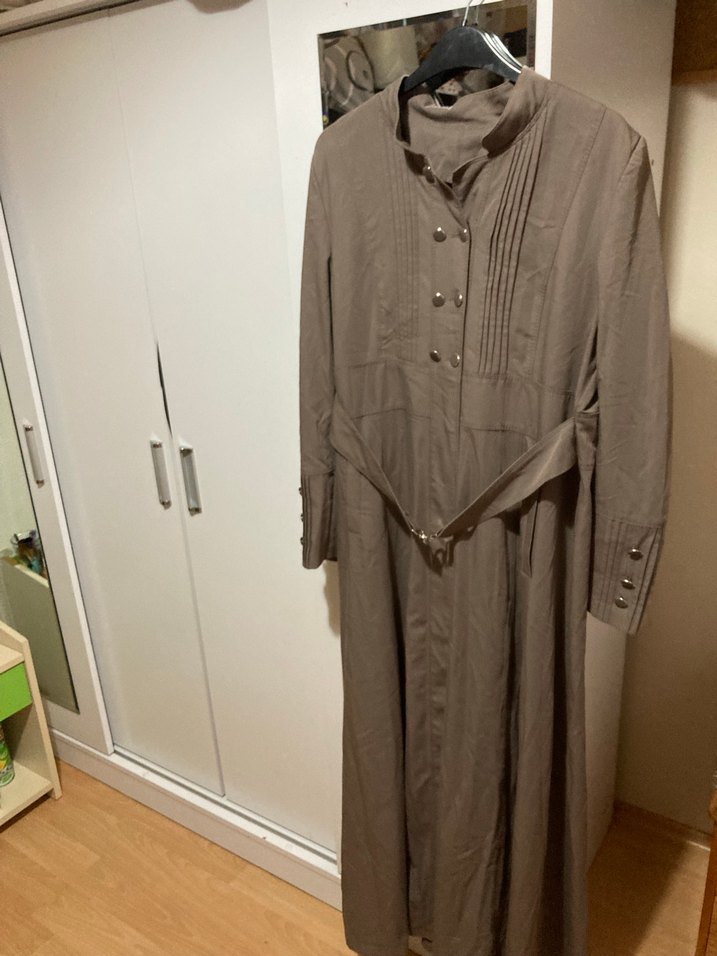 Bej renkli, kemerli, uzun keten kadın kaban. Geniş kesim, uzun kollu, yakası kesik ve vintage normcore tarzında, ofis için uygun.