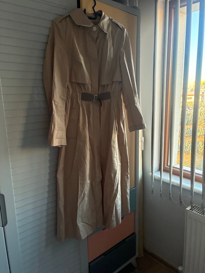 Bej renkli, keten kumaştan, astarsız ve pamuk uzun kollu ve kemerli uzun trençkot. Geniş kesimli, yakası notched lapel ve günlük kullanıma uygun sade bir normcore tarzı.