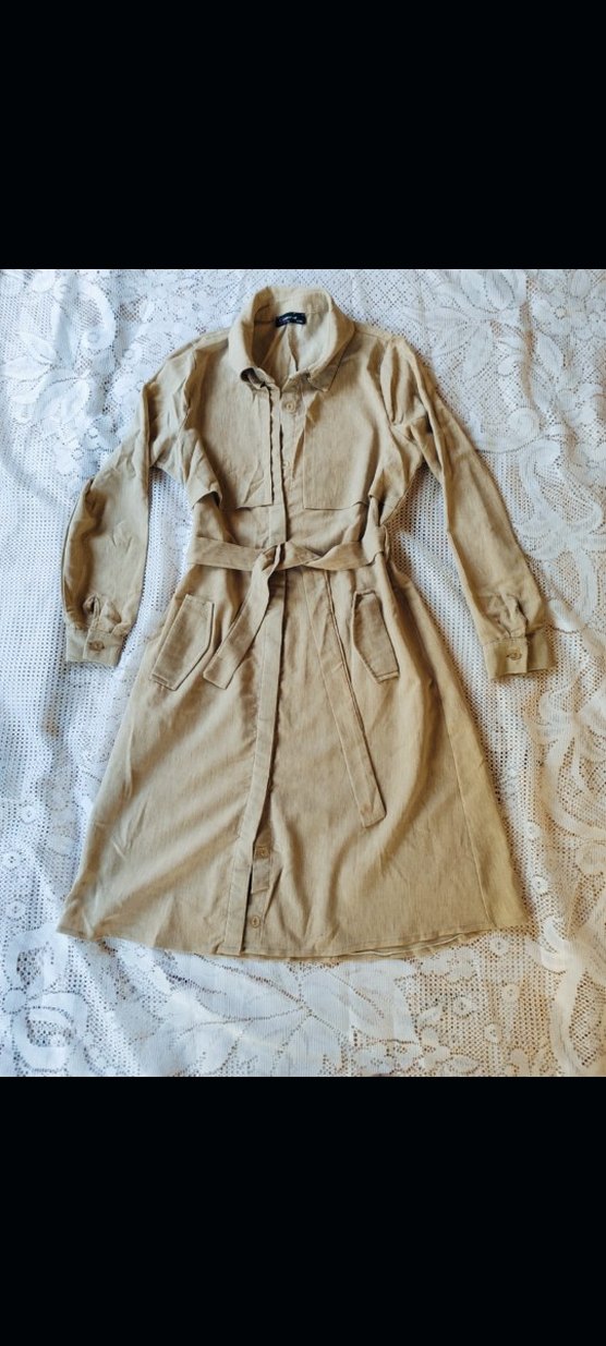 Bej renkli uzun keten tunik. kemerli ve bol kesimdir. Uzun kollu, yakası kesik detaylıdır. Günlük kullanım için uygundur.