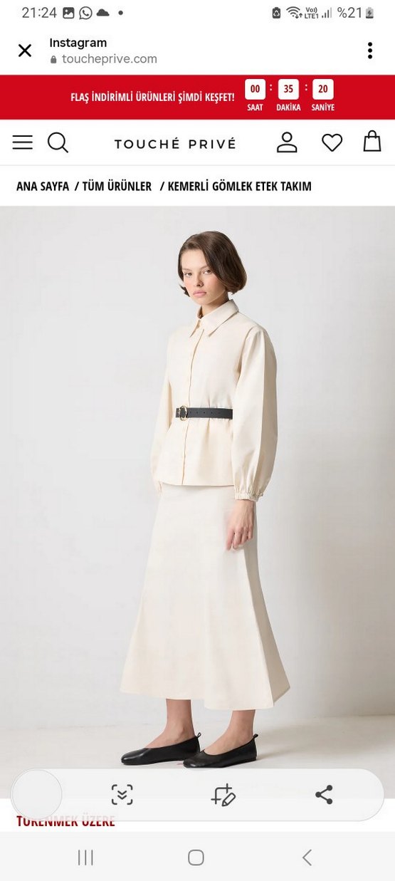 Bej renkli, uzun kollu, pamuk kumaştan gömlek ve etek takımı; kemerli, klasik kesim ve minimal tasarım ile ofis şıklığı sunar.