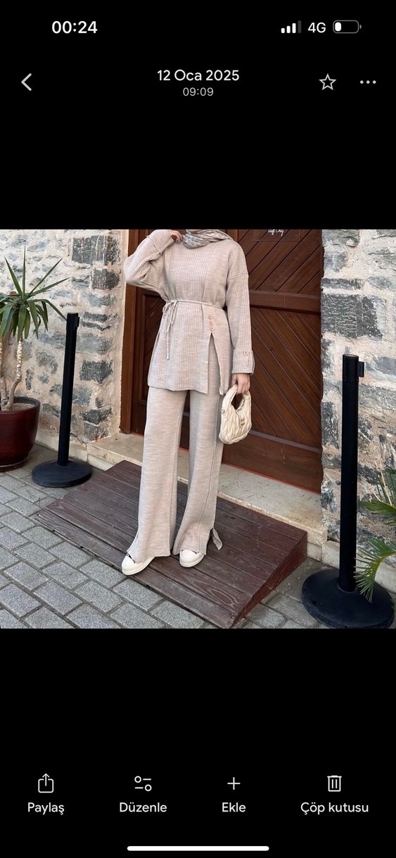 Bej keten kumaştan, uzun kollu, bisiklet yaka, kemerli, bol kesim ve uzun boy kadın takımı. Günlük rahat kullanım için uygundur.