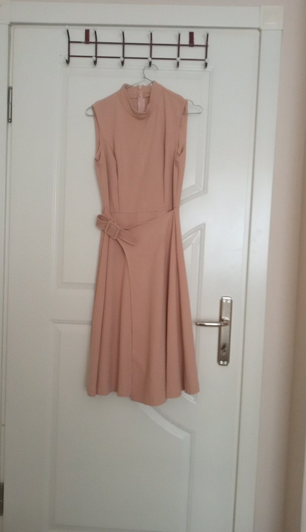Kolsuz, bej renkli uzun elbise, yüksek yakalı ve kemerli. Modern klasik tarzda, ofis kullanımı için uygun, yumuşak sentetik kumaştan yapılmıştır.