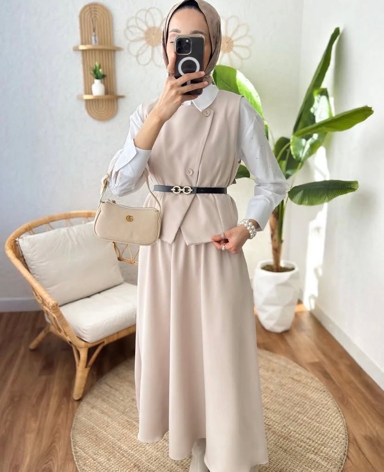 Bej Kemerli Uzun Ofis Elbisesi