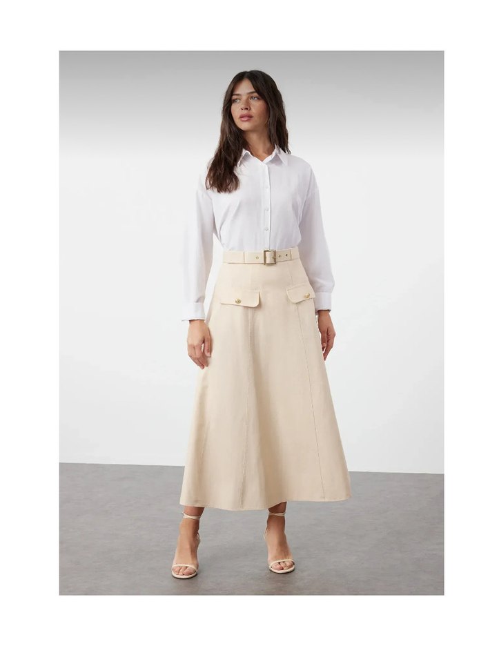Bej renkli, kemerli ve pamuk kumaştan uzun etek. Düzenli kesimi ve desensiz tasarımı ile ofis kullanımı için uygundur.