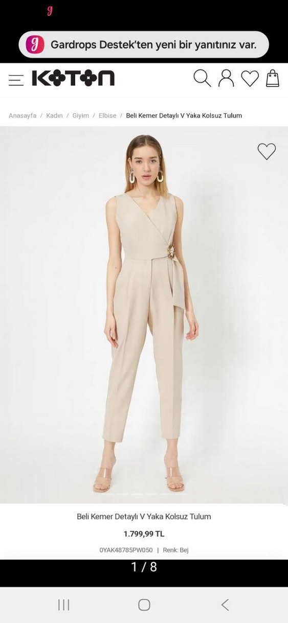 Bej renkli, kolsuz ve V yakalı bu tulum, kemer detayıyla minimalist ve çağdaş bir görünüm sunar. Ofis için uygun, normal boy ve regular fit yapıya sahiptir.Koton marka, 38 beden, DAR KALIP, 36- 38 arası giyenler icin uygun, ÖLÇÜLERE DİKKAT EDİN, kemer detaylı, sırt dekolteli, çok şık bir tulum geçen sezonun ürünüdür, bir kez giyildi etiketi sırtı rahatsız ettigi için kestim. ÜRÜN ÖLÇÜSÜ; GÖĞÜS 45CM, BEL 36CM, KALÇA 53CM.