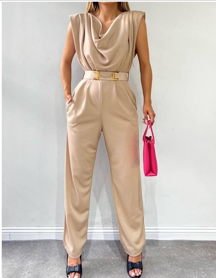 Kemerli, V yakalı, kolsuz bej tulum. Normal kesim ve midi boyda, ofis için uygun. ✨vatkalı