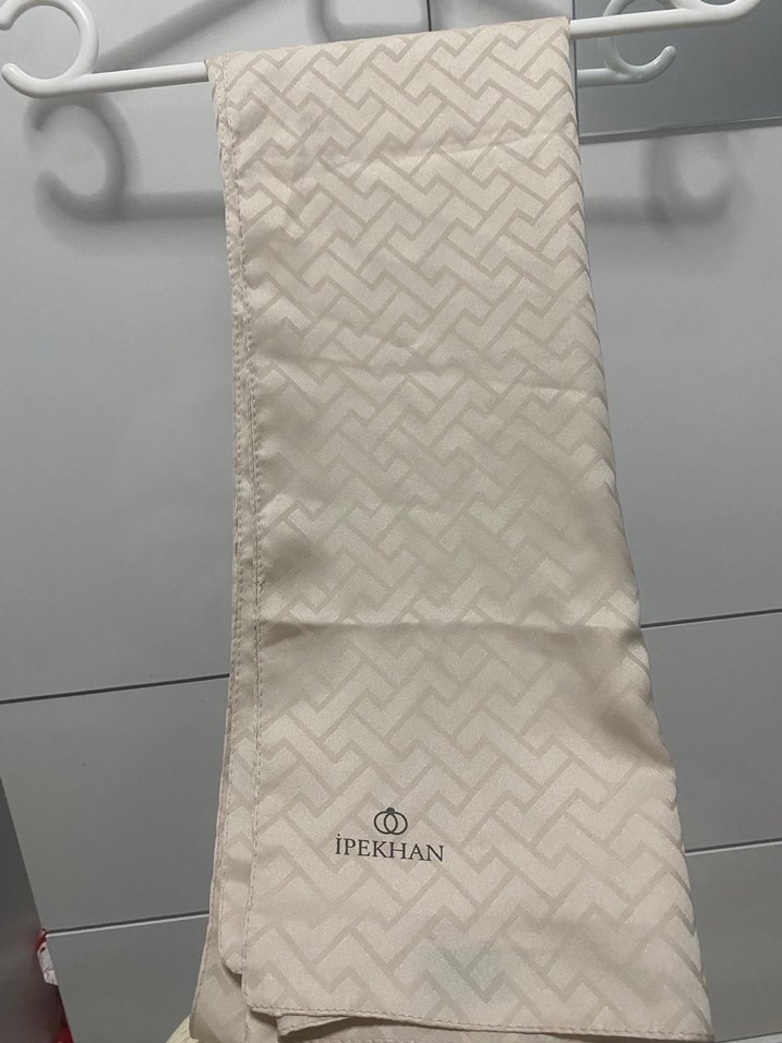 Yumuşak sentetik kumaştan yapılmış, ince desenli ve IPEKHAN markalı bej drapeli kadın şal.