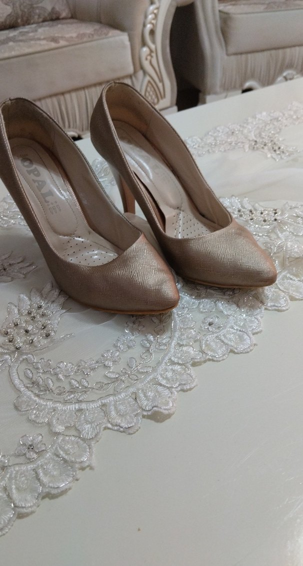 İpek gibi bej renkte, y desenli detaylı stiletto. Düğün ve klasik şıklık için uygundur. Modern klasik tasarımıyla zarafet katar.