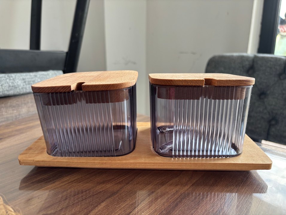 Ahşap kapaklı, şeffaf bölmeli ve bej renkli, çatal kaşık düzenleyici kutudur. Ahşap tepsi üzerinde pratik kullanım sağlar. Hiç kullanılmadı