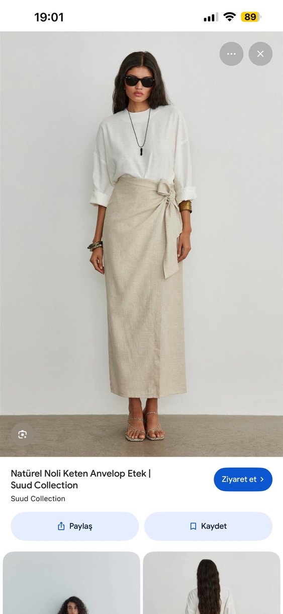 Bej renkte, keten kumaştan, drapeli anvelop uzun etek. Minimalist ve bohem tarzda, rahat kesimle günlük kullanıma uygundur.