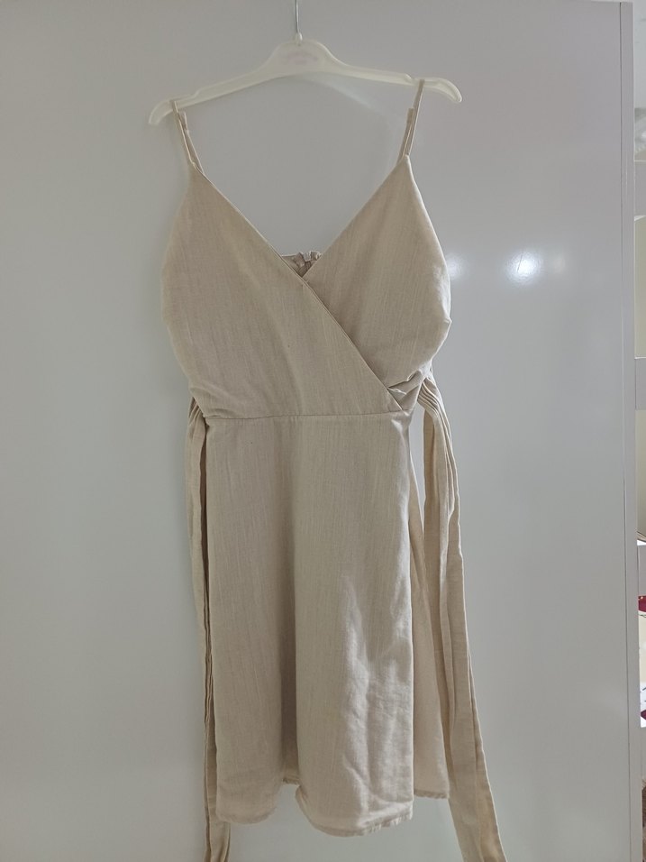 Bej keten mini elbise, V yaka ve drapeli tasarıma sahip. Askılı kollu ve bol kesimli, minimalist bohem tarz için uygun.