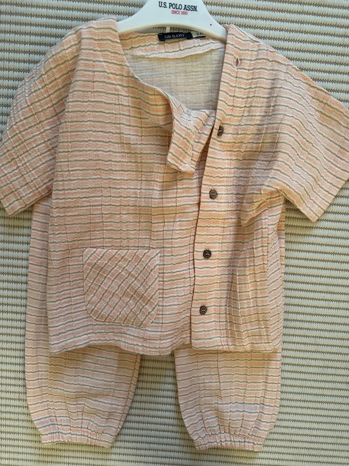 Keten kumaştan, bej renkli, kısa kollu, düğmeli ve yakası kesik bohem tarzda bebek takımı. Ön cepli ve lastikli paçalı pantolon içerir. Sıfır hiç kullanılmadı