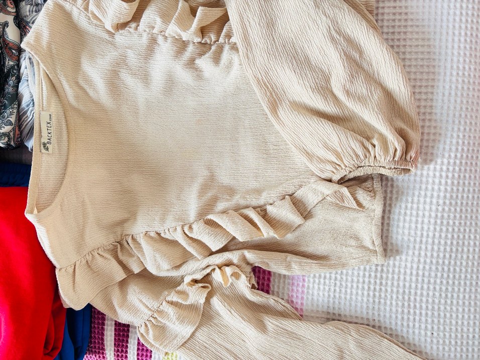 Bej renkli keten bluzu, kayık yaka uzun kollara sahiptir. Fırfırlı detayları ve bol kesimiyle bohem tarzı yansıtır. Günlük kullanım için uygundur, midi boydadır.