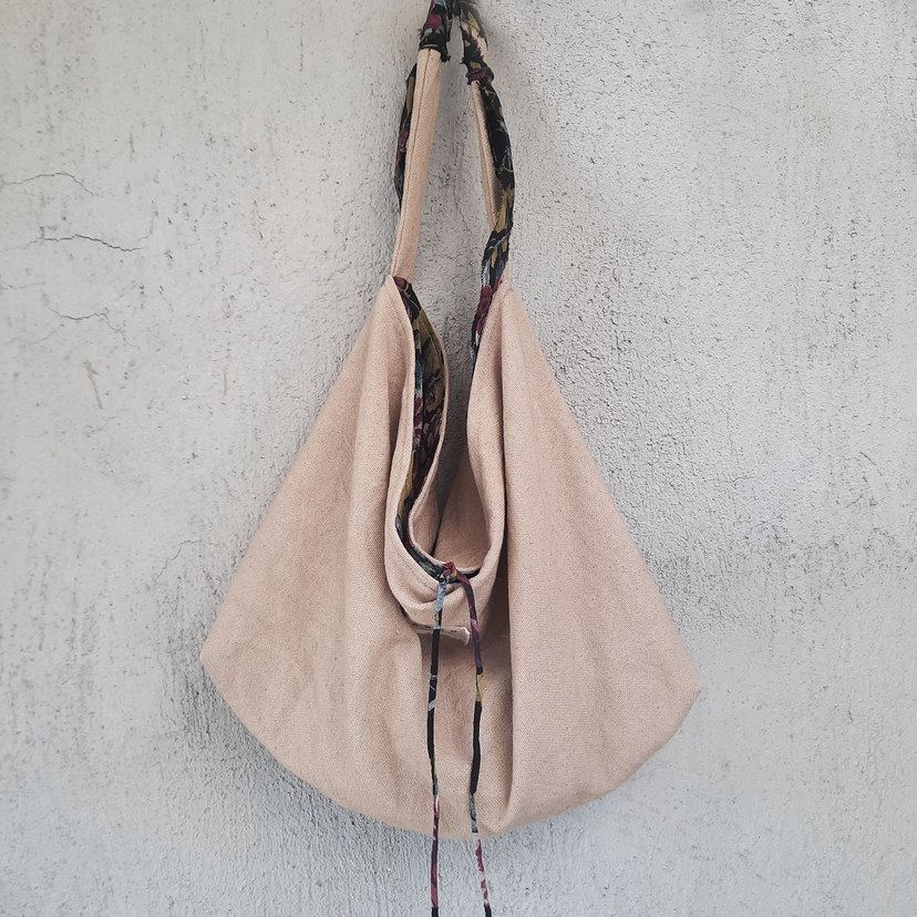 Bej keten kumaştan yapılmış, bohem tarzda kadın çantası. Kalın keten kumaş ceviz kabuğu ile boyandıktan sonra dikilmiş büyük boy salaş çanta Astarlıdır, biri fermuarlı 2 büyük cebi vardır Boyut 60 x 40 cm