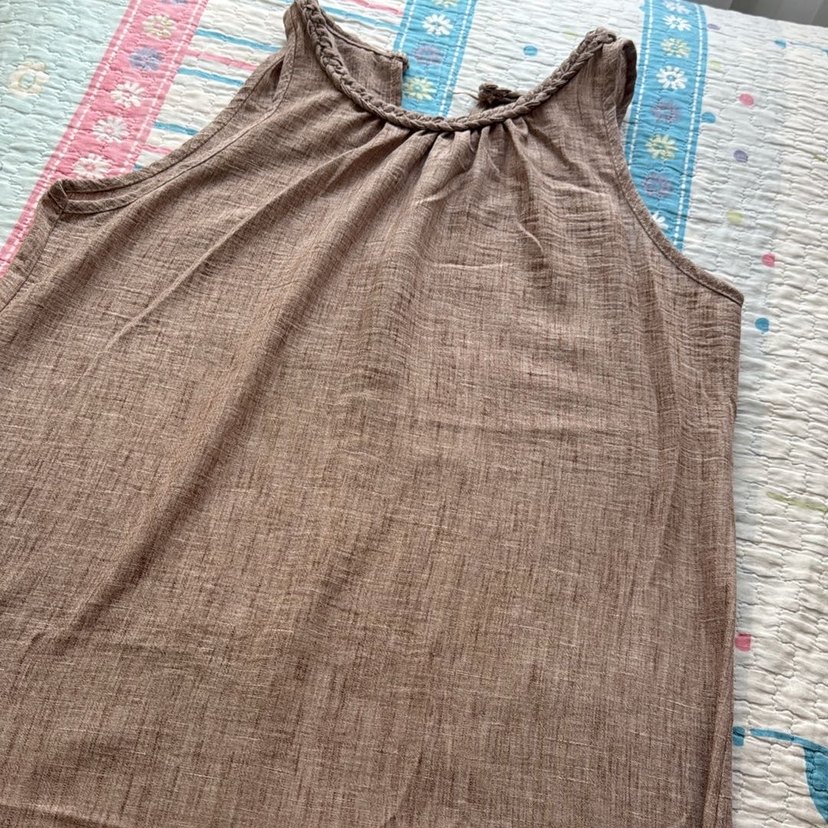 Bej keten kumaştan, kolsuz, salaş kesim ve drapeli kayık yaka hamile elbise , midi boyda ve bohem tarzda.