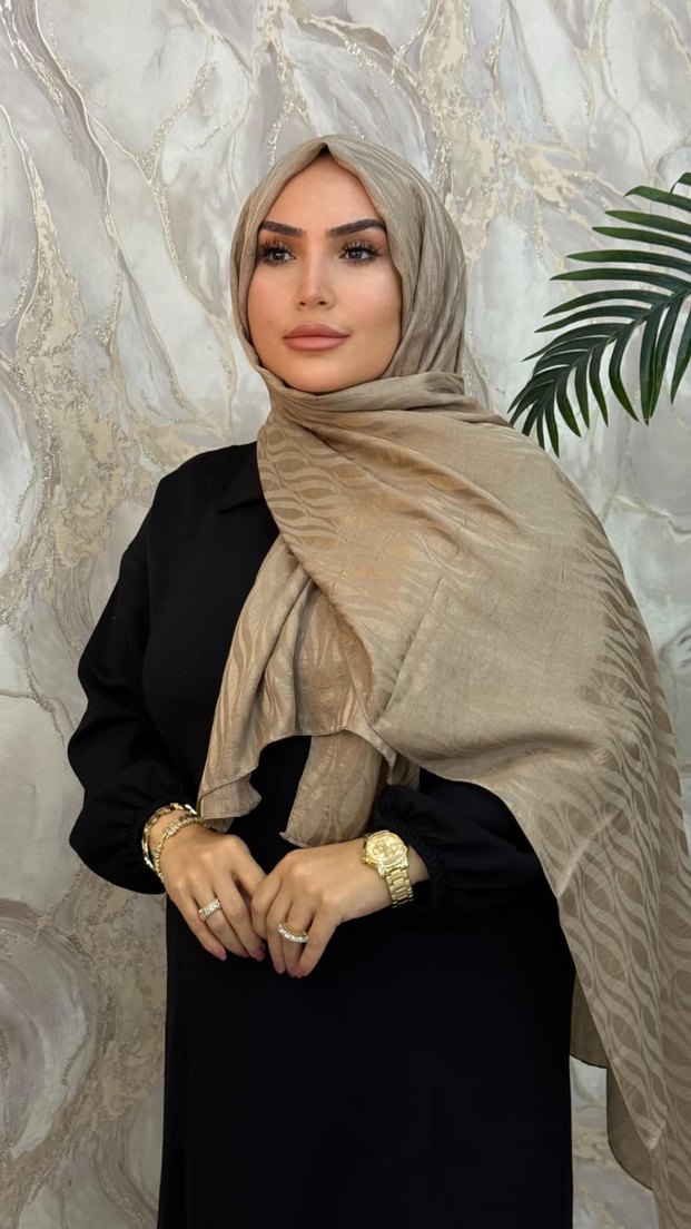 Bej keten kumaştan, gri tonlarıyla hafif desenli, bohem ve rahat kesim kadın şal.