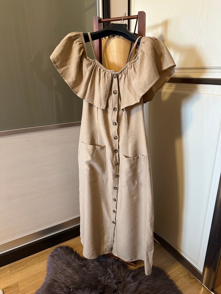 Bej keten kumaştan, straplez geniş fırfırlı, düğmeli ve bol kesim uzun elbise. Kolsuz ve iki ön ceplidir.