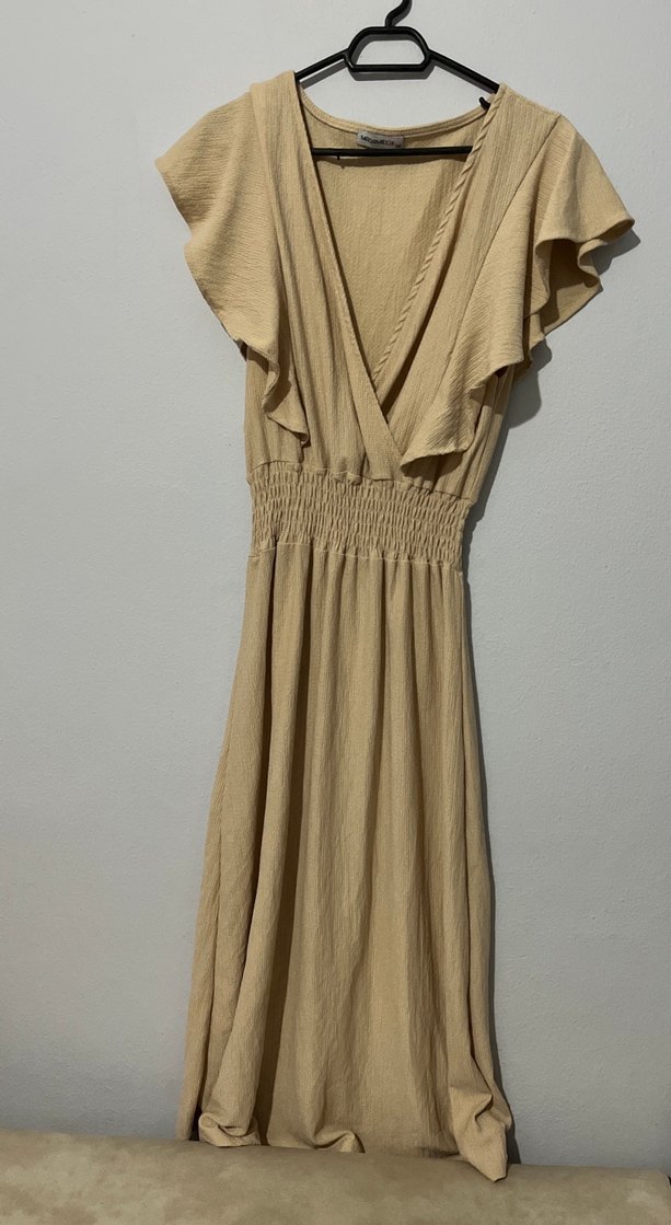 Bej keten kumaştan, V yaka ve kolsuz, dökümlü tasarıma sahip bol kesim uzun elbise. Bel kısmı büzgülü, bohem tarzda günlük kullanım için uygun. 125 cm
