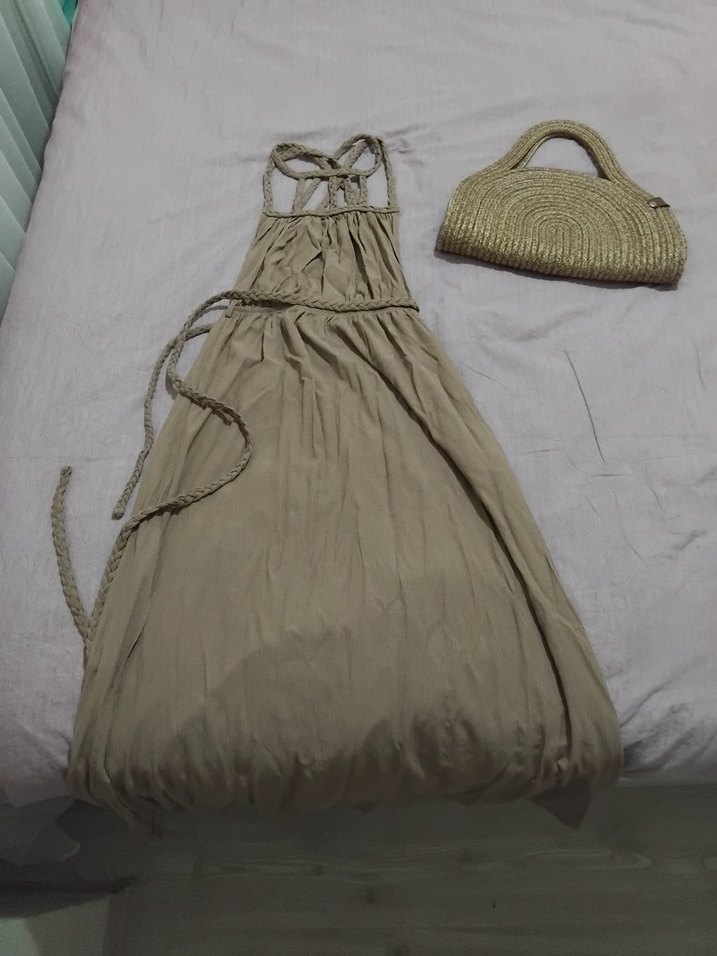 Bej keten uzun elbise, askılı detaylı, bol kesim tasarıma sahip. Bohem tarz için uygun. Çok ama çok şıkk duruyor kendi görsellerimi yükledim. sıfır diyebilirim çünkü yeni alındı ve 2 saat giydim.